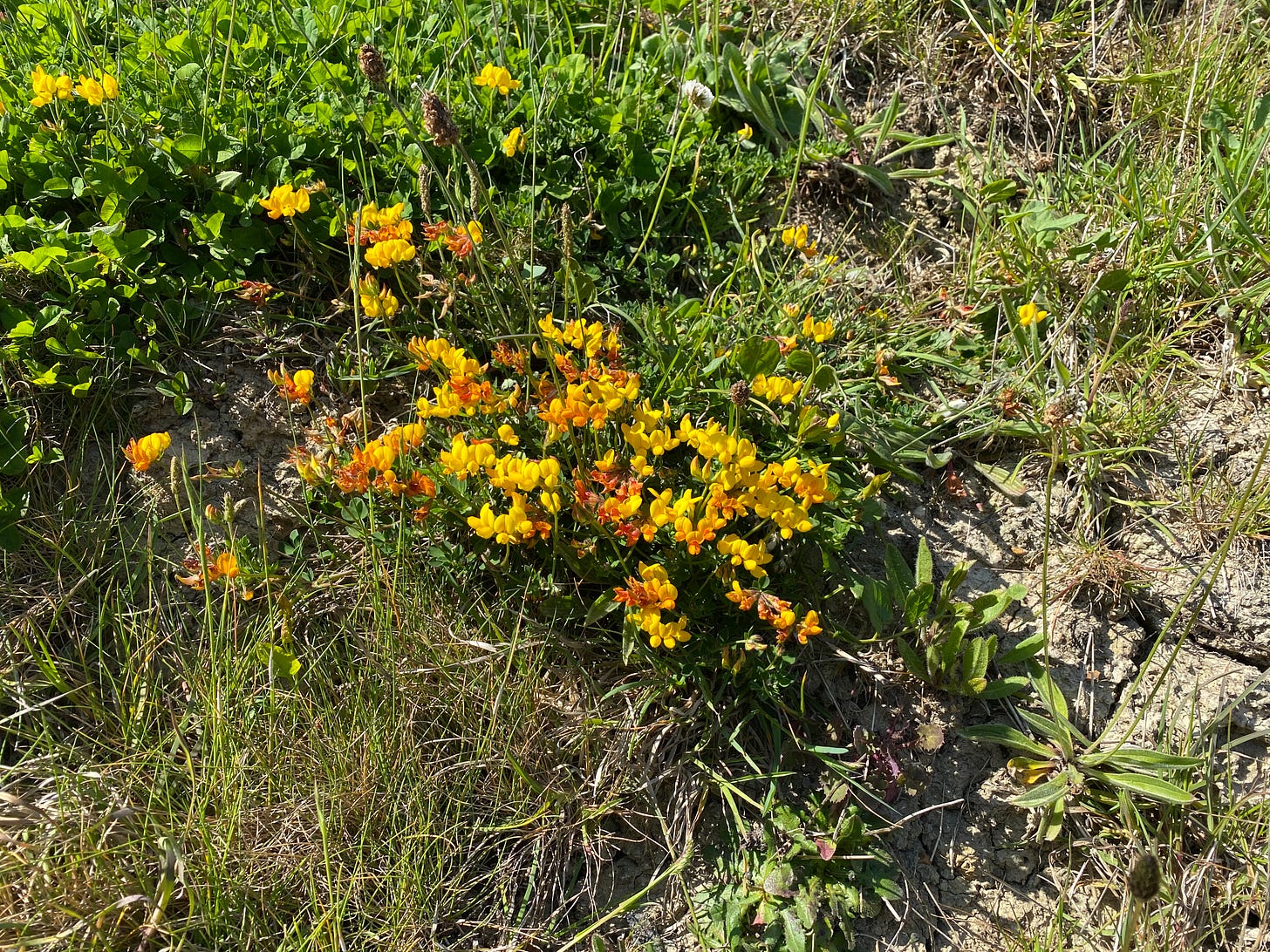 The flowers so obviously put them into the pea family, the Leguminosae or Fabiaceae. The mowed grass around our new home is full of them along with other yellow flowers like Buttercups, Potentillas and Black Medic(k). When I saw the Eggs and Bacon and the Black Medic I had to dredge my memory for their names, before googling to check and I realised that I was recalling them from the same field trip where I learned about looking for badger hairs. At sixteen I had opted to only take zoology A level but Vera Clarke rekindled my enthusiasm for botany as I realised that all animal life relies on the photosynthesising plants surrounding them. It was a light bulb moment for me then.