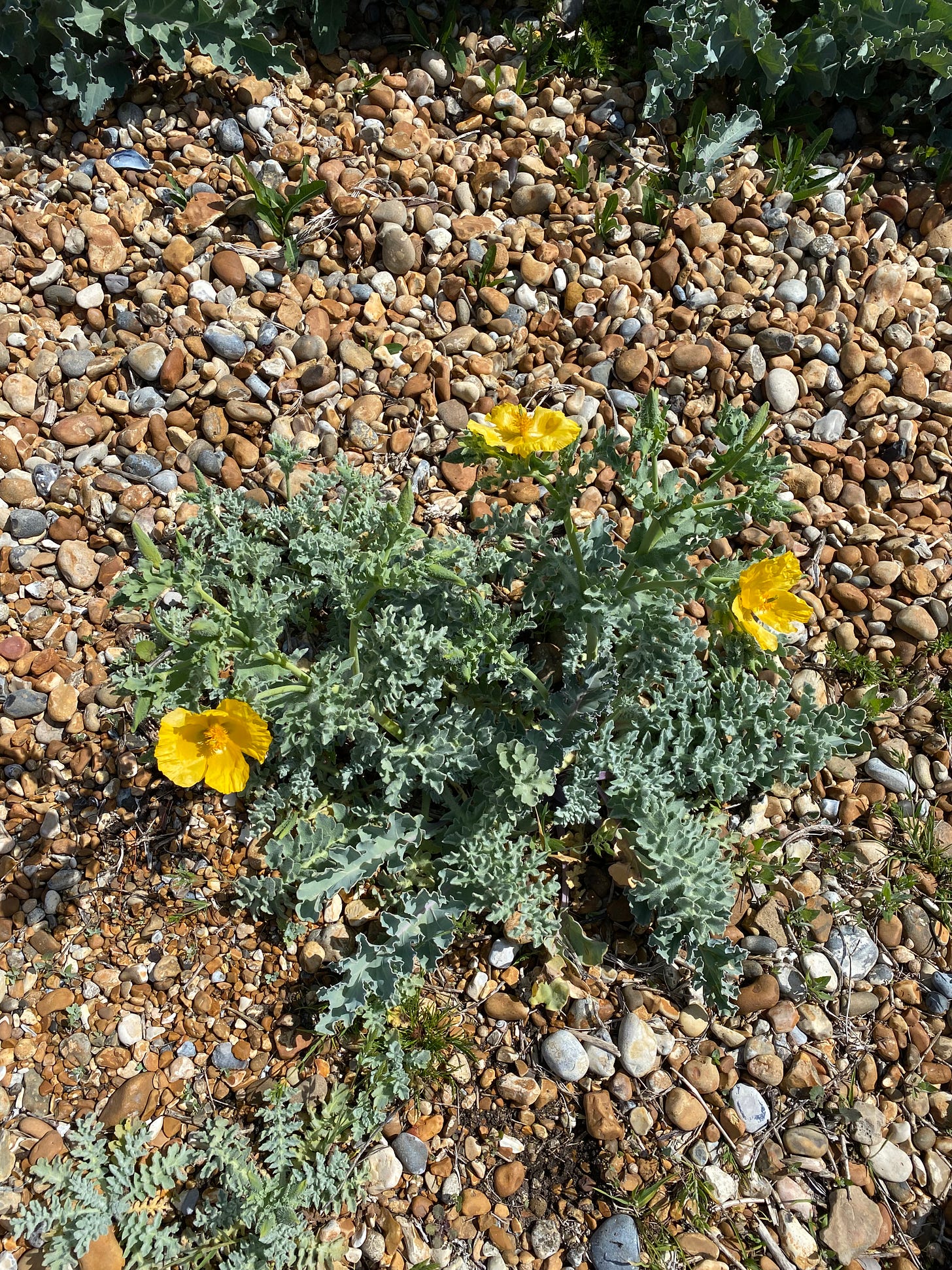 I'll start where I finished my last effort, at Bulverhythe. It's not the most inspiring cycle and walking path. It runs alongside the railway line from the end of St Leonards "promenade" to the Ravenside Retail Park by Glyne Gap Beach and it's protected from erosion by huge granite boulders dumped at the top of the shingle beach though winter storms often throw the shingle right over the path and even through the fence onto the railway's side. That description doesn't sound like an ideal environment for wild flowers but that's exactly where the Sea Kale flourishes. Alongside it there are lots of Yellow Horned Poppies.
